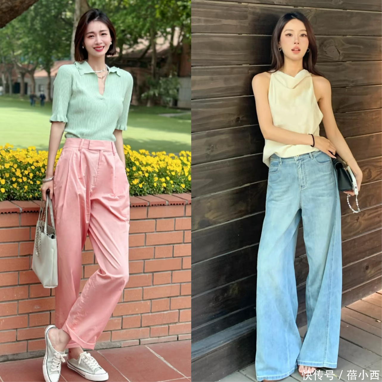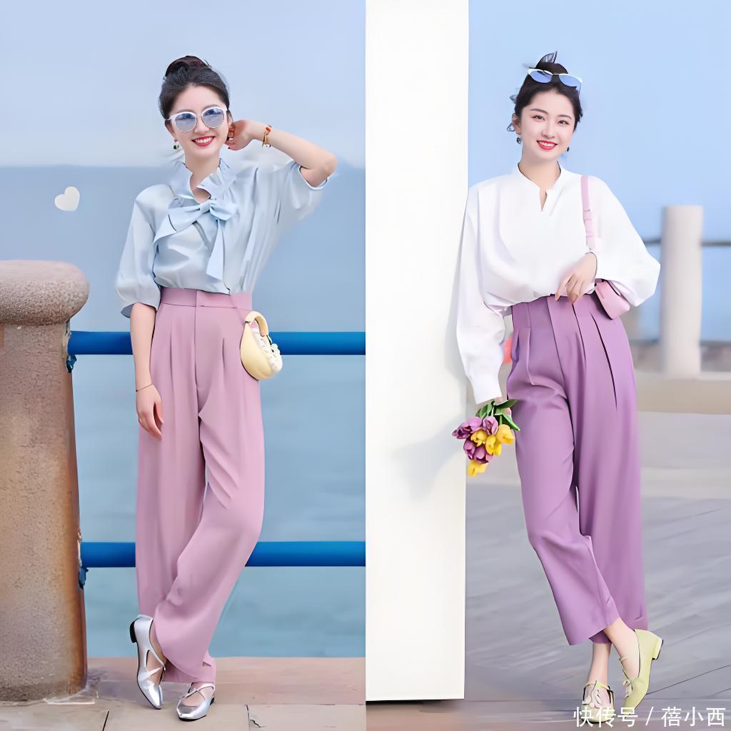 比如下面这些浅粉色或者是浅蓝色的阔腿裤,颜色非常柔和,穿在身上自带温柔知性的感觉,衬得整个人肤色也很白皙,搭配浅色的上衣,形成撞色的搭配效果,时尚度会大幅度提升,看起来特别洋气。