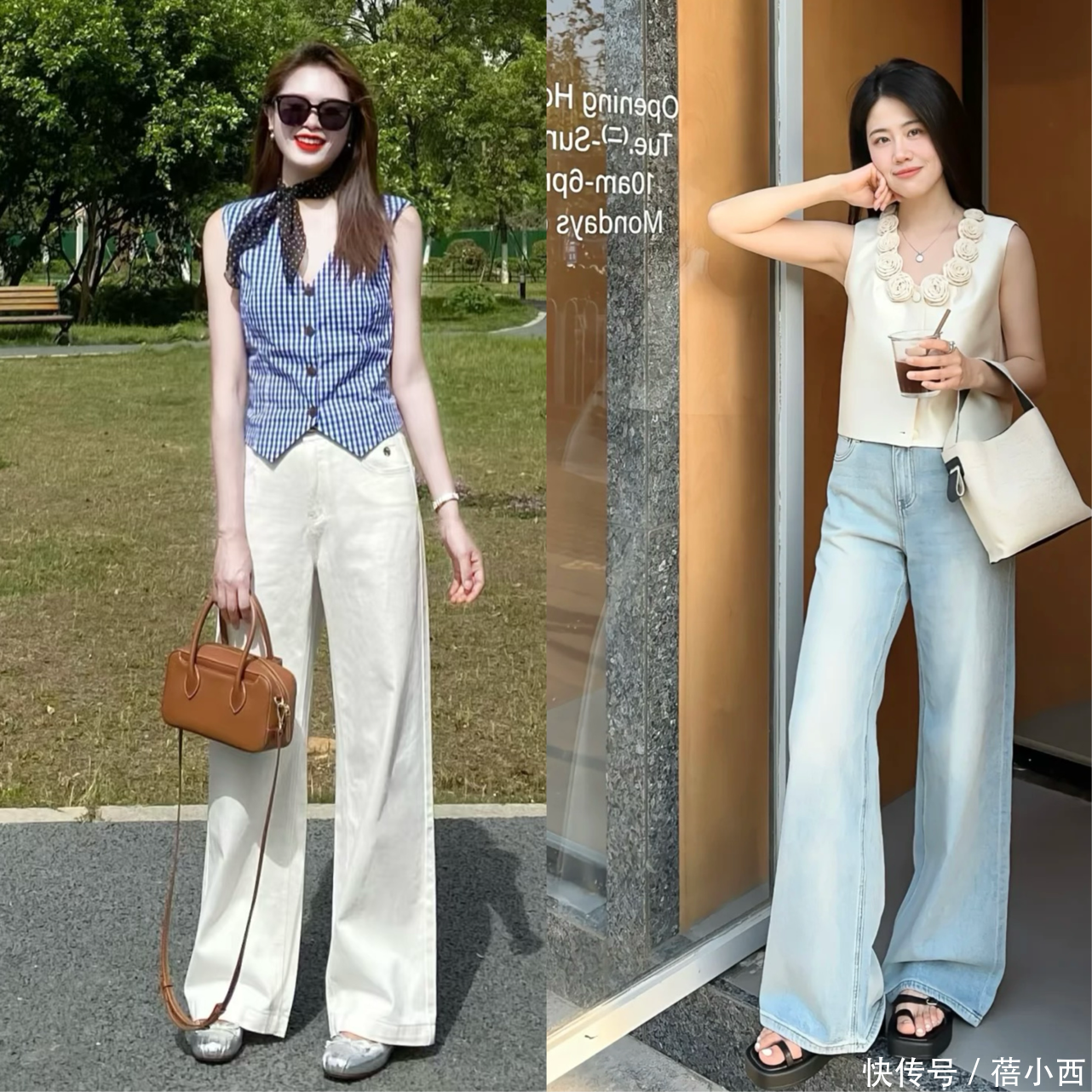 别以为阔腿裤很百搭就可以随便搭,要是想穿的时髦还显瘦,推荐美眉们的上衣别太宽松,不然跟阔腿裤搭在一起容易显壮。选修身点的t恤、真丝衬衫,或者短款的马甲外套,松紧对比着来,看着就清爽。